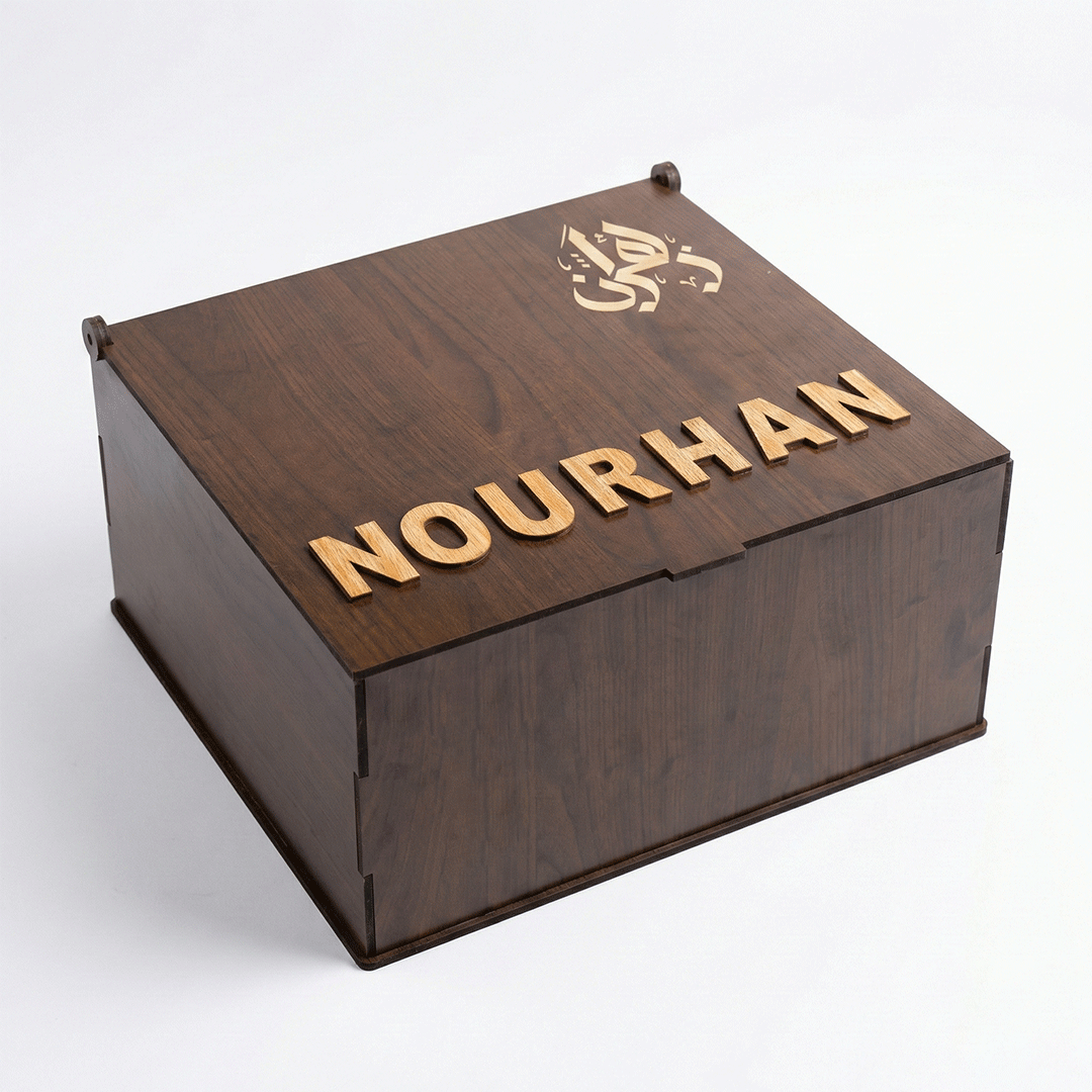 • Premium wooden box, 40×35 cm, height 20 cm, wall thickness 6 cm, crafted from the finest quality wood with an elegant finish, engraved with a custom name of your choice